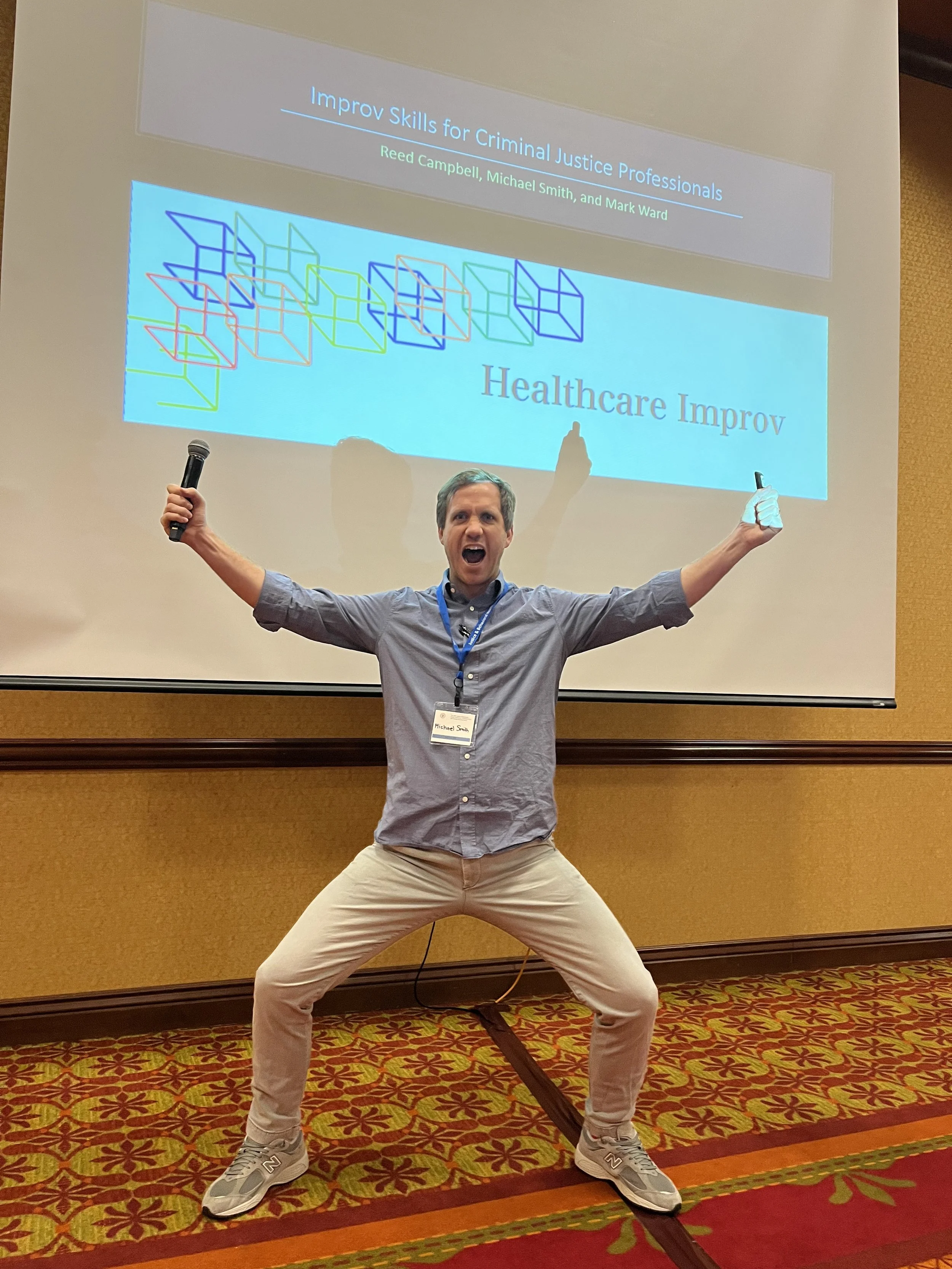 Armed with a microphone, slide clicker, and a love of improv based skills workshops!